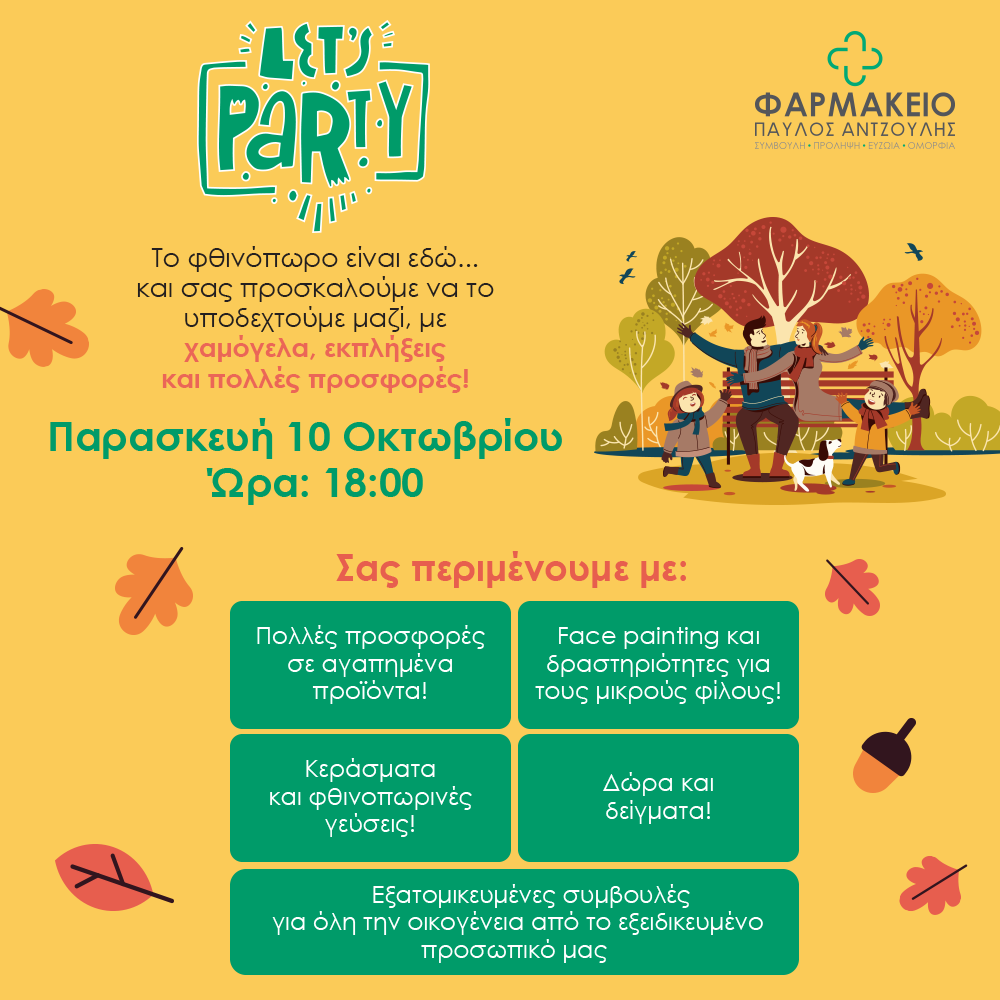 Το φθινόπωρο ξεκινά με μια ξεχωριστή γιορτή στα Φαρμακεία Παύλος Αντζουλής. Σας περιμένουμε την Παρασκευή 10 Οκτωβρίου στις 18:00 με εκπλήξεις, πολλές προσφορές, δραστηριότητες για μικρούς και μεγάλους και μοναδικές φθινοπωρινές γεύσεις.